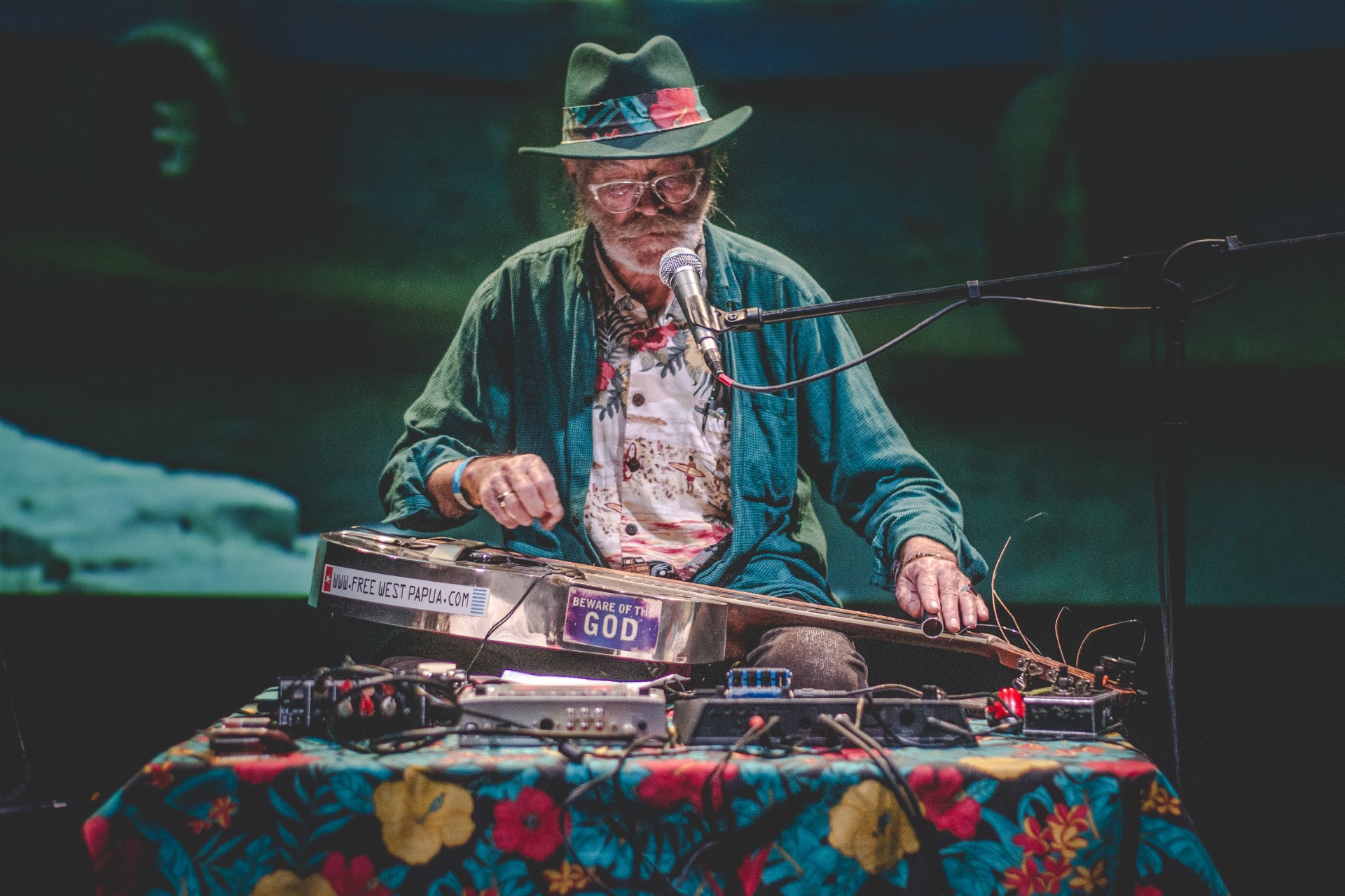 Mi música se centra en la improvisación y la composición instantánea. El instrumento principal que utilizo es una guitarra Lap-Steel o hawaiana, un instrumento que suele asociarse a la música hawaiana o al country estadounidense. Mi intención ha sido liberarla de ese cliché y de esos géneros. La guitarra Lap Steel se utiliza para tocar música en muchos otros lugares y estilos de todo el mundo, como la vietnamita, coreana, indonesia, india, etc,etc; esas músicas han influido en mi forma de tocar, así como la improvisación libre europea, el free jazz, el blues, el pop contemporáneo y la música exótica. Amplío mi Lap Steel, que es analógica, incorporando efectos digitales para transformar su sonido, además de utilizar una tableta Samsung, un iPad Mini y un iPhone, todos ellos cargados con diversas aplicaciones para construir mis improvisaciones y composiciones instantáneas en directo. Una orquesta de sobremesa, verdaderamente. La voz y el canto es otro de mis campos de interés, y desde hace varios años preparo una serie de textos que canto. La mayoría de estas piezas están hechas utilizando la técnica de recortes de William Burroughs y Brion Gysin aplicada a dos de las novelas de Thomas Pynchon El arco iris de la gravedad y V. para producir un corpus que, de alguna manera, a pesar de este método de selección aleatoria, parece expresar parte de mi preocupación por los océanos, la posible subida del nivel del mar en el futuro y sus consecuencias, que incluyen la inmigración, en un posible "futuro post-diluviano”. Sin embargo, estas "canciones" no están preparadas de antemano para ser presentadas de la manera estándar. Sólo está fijado el texto y no se lleva al concierto ninguna melodía, estructura de acordes o armonía preconcebidas, todo se improvisa en el momento; no hay "lista de canciones", sólo un montón de papeles con mi texto, que iré seleccionando al azar a medida que avance el concierto, normalmente sin solución de continuidad. Mis conciertos suelen ser largos, sin pausas, y duran al menos una hora. En la medida de lo posible, me acompaño de una selección de mis propios vídeos de la serie Island Gardens, filmados a lo largo de varios años en viajes realizados principalmente por zonas tropicales. Las islas someras de los océanos Pacífico e Índico ya están experimentando los efectos del calentamiento global y la subida del nivel del mar.